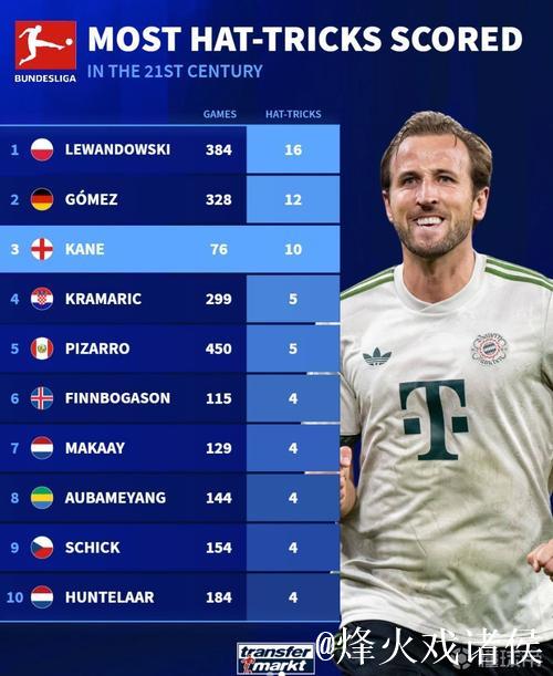 本世纪德甲戴帽数前10:莱万384场16次第1,凯恩